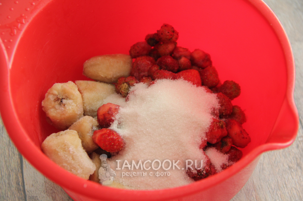 В чаше или миске соединить клубнику, кусочки банана и всыпать сахар.