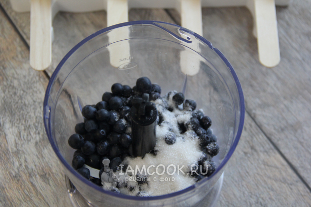 Ягоды с сахаром выложить в чашу измельчителя и пробить в пюре. Отставить в сторону на пару минут, чтобы сахар полностью растворился.