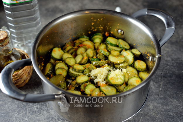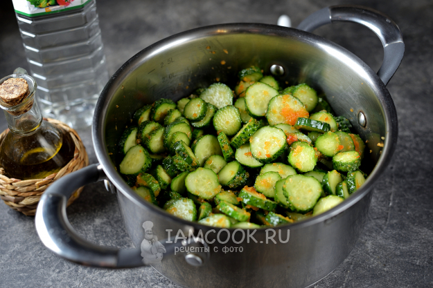 На огурцах обрежьте хвостики, нарежьте их кружочками толщиной 2-3 миллиметра, добавьте в кастрюлю, перемешайте и варите на умеренном огне 5 минут. Старайтесь перемешивать салат почаще.
