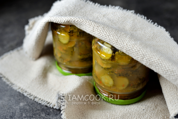 Разложите готовый салат по чистым простерилизованным банкам, закрутите крышками, переверните вверх дном и укутайте до полного остывания.