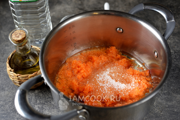 Переложите овощную икру в кастрюлю, всыпьте соль и сахар, влейте уксус и масло, проварите на умеренном огне минут 5.