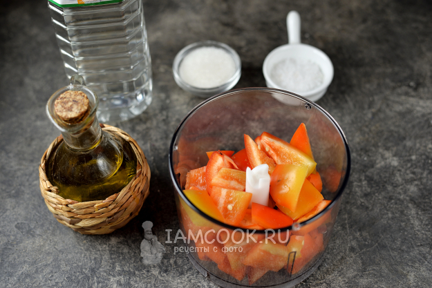 Острый и болгарский перцы очистите от семечек и плодоножки, порубите их и морковь крупными кусками, переложите в блендер, пробейте до состояния икры. Также эти овощи можно смолоть на мясорубке с мелким решетом.