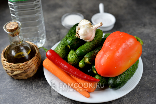 Пропорции продуктов для заготовки салата «Шантане» из огурцов на зиму - в списке ингредиентов.