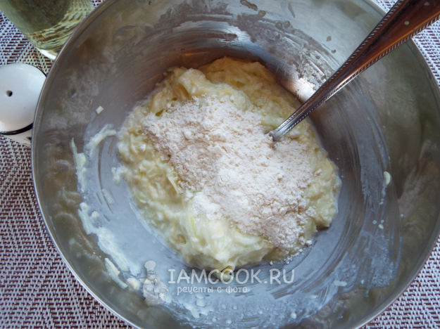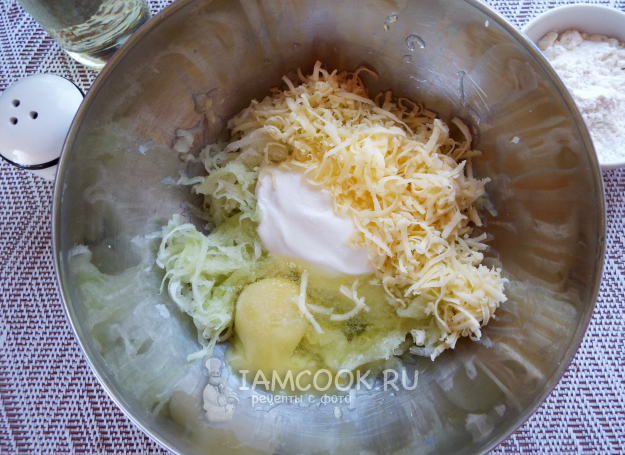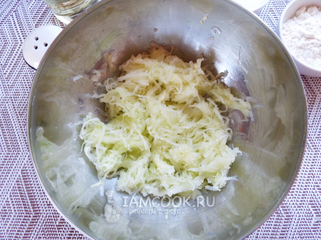 Очищенный кабачок натереть на мелкой тёрке и немного отжать.