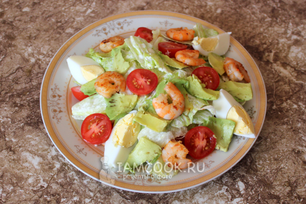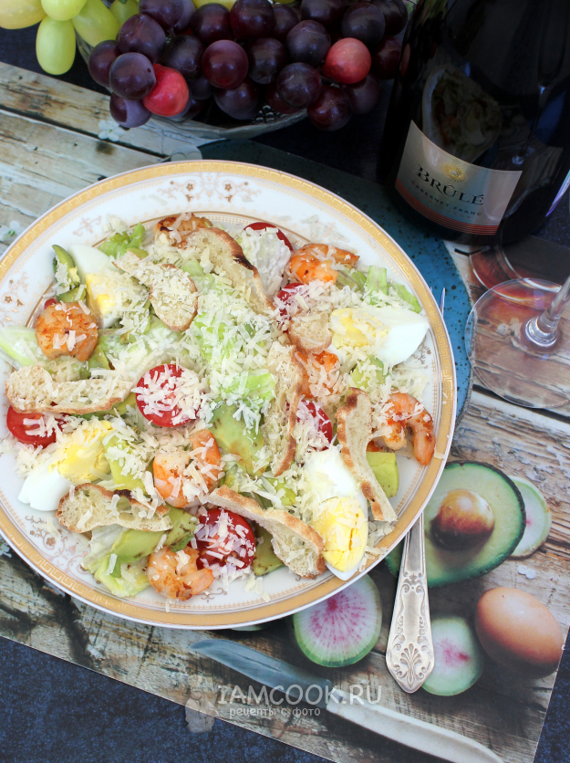 Подавать салат «Цезарь» с креветками и авокадо рекомендуется сразу же. Хотя... у меня он (без сухариков) иногда стоит часа четыре до подачи в холодильнике и все нормально.