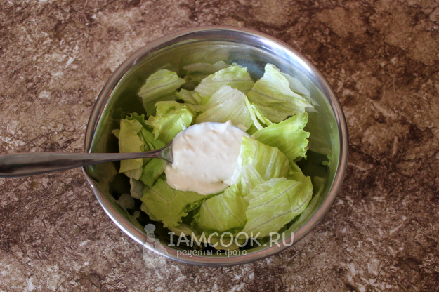 Листовой салат порвите на кусочки, перемешайте в глубокой миске с заправкой для Цезаря.