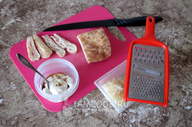 Для простых сухариков заранее тонко нарежьте толстый лаваш на кусочки и дайте им подсохнуть.