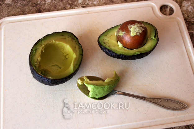 Спелое авокадо можно либо нарезать тонкими ломтиками, либо кубиком, а ещё есть вариант – выскоблить куски мякоти чайной ложкой.