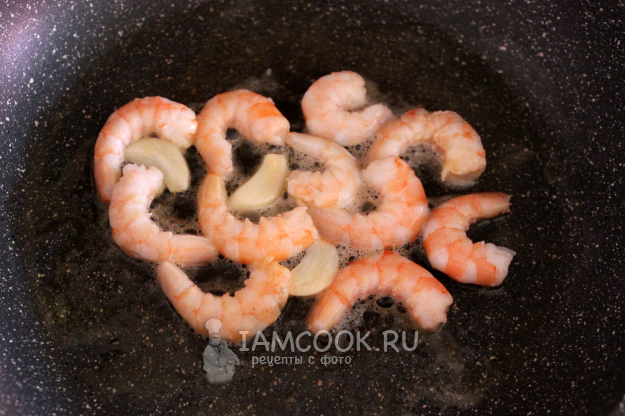 Креветки (розовые, вареные замороженные) нужно ополоснуть теплой водой, очистить от головы и панциря и затем обжарить на сливочном масле с дольками чеснока и слегка посолив. На среднем огне с двух сторон до легкой поджаристости крупным креветкам понадобится 5-6 минут.