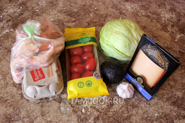 Подготовьте ингредиенты для салата «Цезарь» с креветками и авокадо.