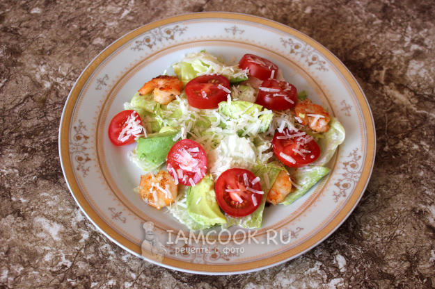 Уложите половину заправленного листового салата на плоское блюдо. Разложите на нём половину креветок, половину порции авокадо, и часть черри, нарезанных половинками. Слегка посыпьте тёртым твердым сыром.