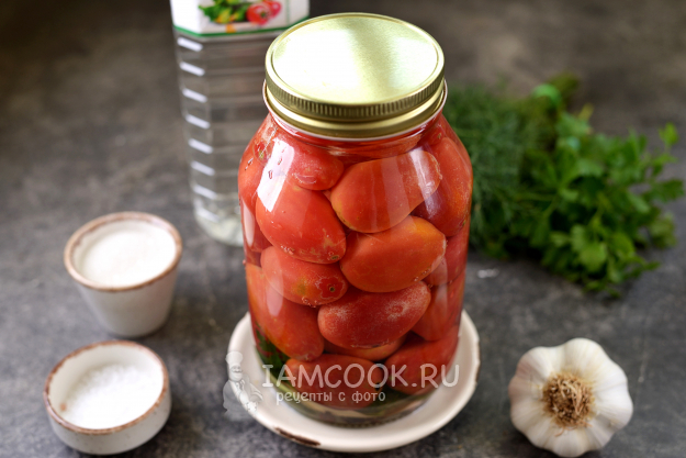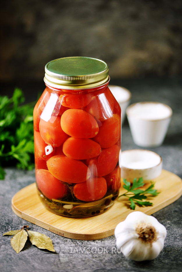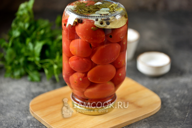 Залейте кипящим маринадом банку с помидорами так, чтобы он переливался через край. Сразу же закрутите заготовку крышкой, протрите мокрой тряпкой, переверните вверх дном и укутайте чем-то теплым до остывания.