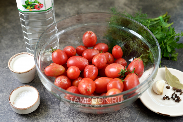 Продукты для заготовки сладких маринованных помидоров черри на зиму (без стерилизации) подготовьте по списку ингредиентов.