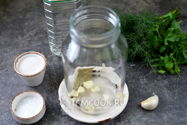 На дно банки положите оба вида перцев, лавровый лист, гвоздику и нарезанный слайсами чеснок.