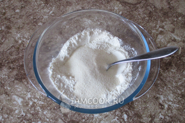 Соедините и перемешайте муку, манку, разрыхлитель, соль и сахар.