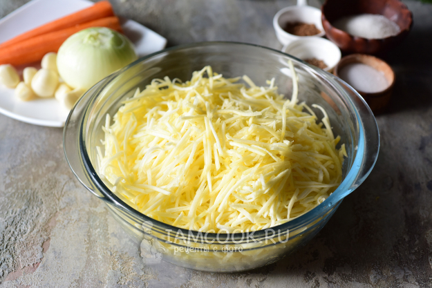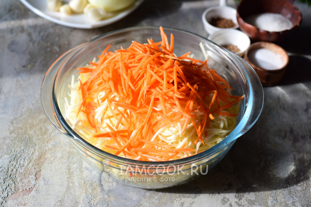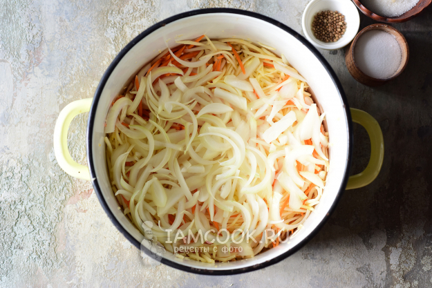 Измельченные патиссоны и морковь выложим в просторную кастрюлю. Добавим к этим овощам лук, нашинкованный перьями или полукольцами.