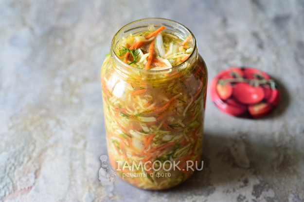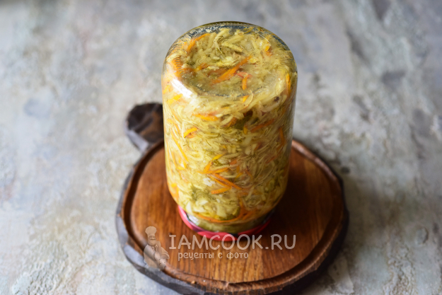 Через 3 часа овощи пустили достаточно сока. Переложим всю массу в стерилизованную баночку (у меня литровая) так, чтобы овощной сок хорошенько покрывал все.