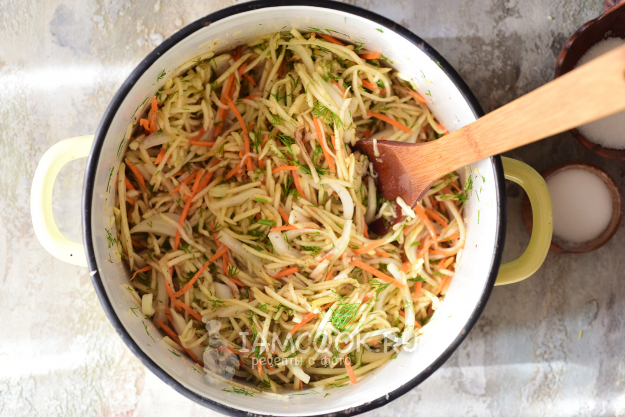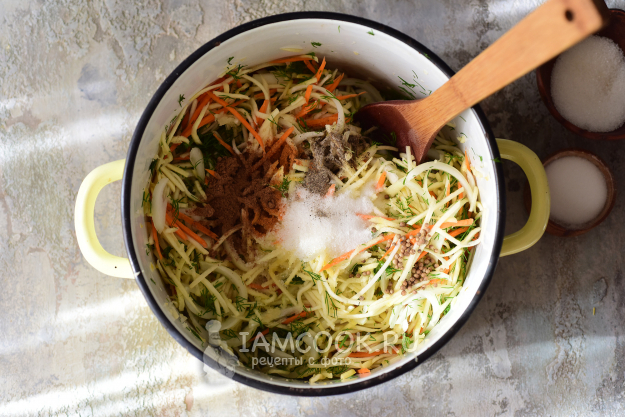 Перемешаем активно все эти ингредиенты и оставим овощную массу на 3 часа под закрытой крышкой. В течение этого времени несколько раз овощи помешаем ложкой.