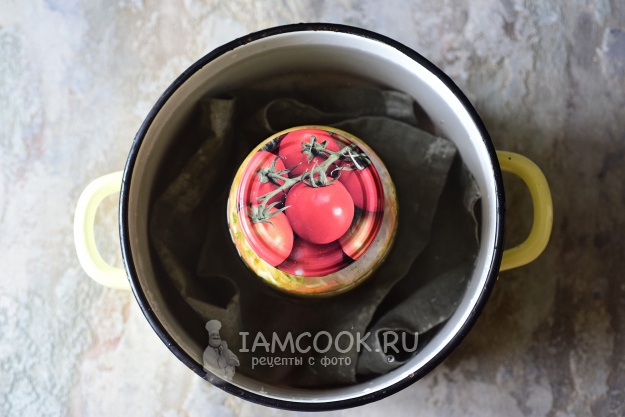 Заполненную банку прикроем крышкой, поставим на дно кастрюли с водой, на дно кастрюли заранее выложим кухонное полотенце. Уровень воды в кастрюле должен быть максимально высоким - в идеале до плечиков банки. Стерилизовать заготовку в банке будем в активно кипящей воде 35 минут с момента закипания жидкости.