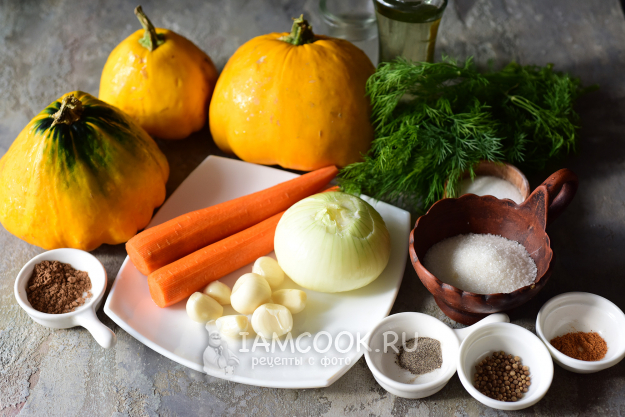 Подготовим необходимые ингредиенты для заготовки салата из патиссонов по-корейски на зиму.