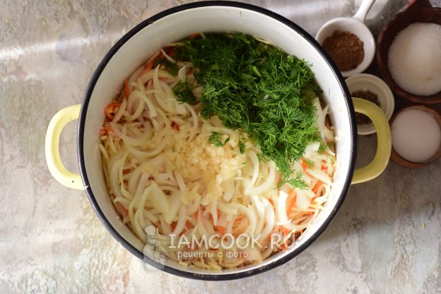 Выдавим в кастрюлю к овощам через пресс весь чеснок и добавим укроп, мелко порубленный. Перемешаем.