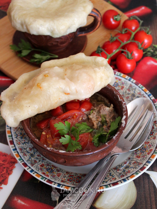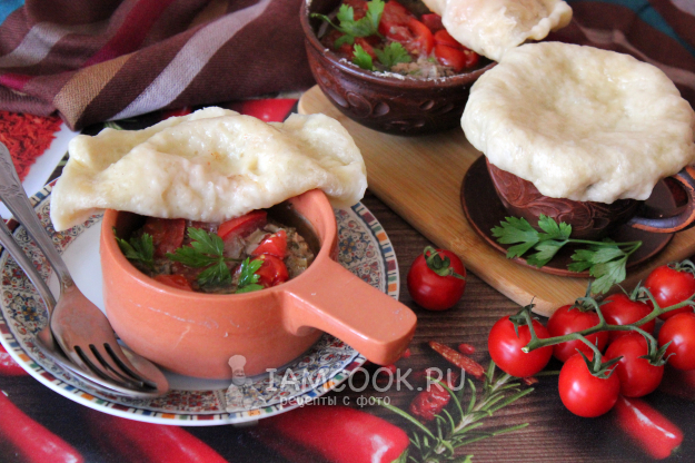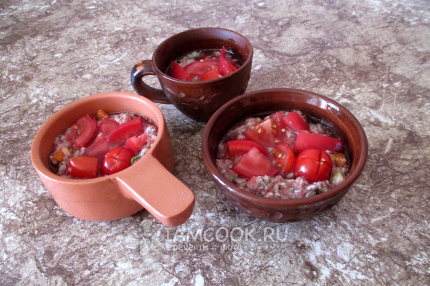 Наполните формы сочной мясной начинкой практически доверху, добавьте кусочки помидоров. Из теста сделайте лепешки такого диаметра, чтобы хватило закрыть формы.