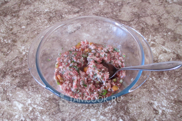 Влейте в фарш с овощами холодную воду, добавьте соль и молотый перец. Все ингредиенты перемешайте между собой.