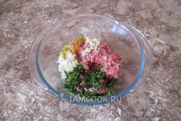 Для начинки мелко нашинкуйте лук, измельчите чеснок, порубите свежую зелень и кубиком нарежьте перец.