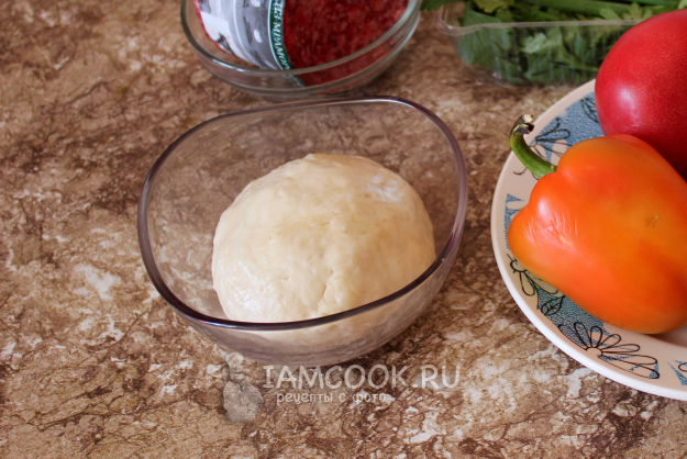 В моем варианте будет простое дрожжевое без яиц. Нужно перемешать муку, соль, сахар, сухие дрожжи, затем влить воду комнатной температуры и вымесить тесто в течение трех минут. Пусть побудет при комнатной температуре 20-30 минут. Не забудьте укрыть от высыхания.