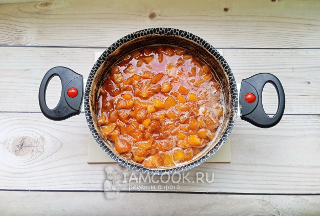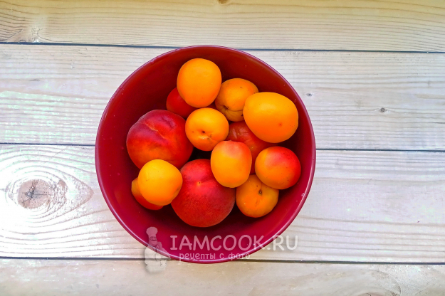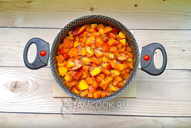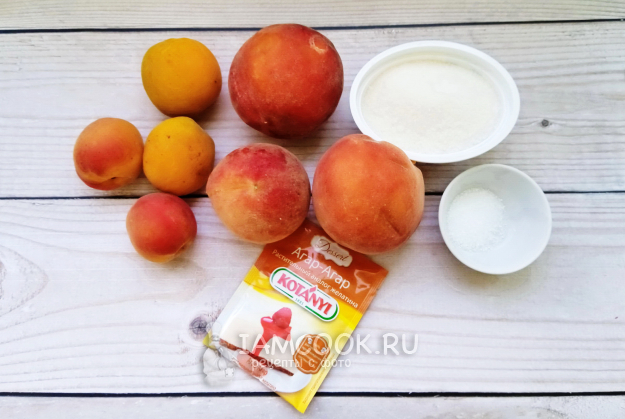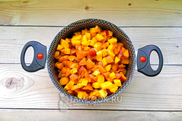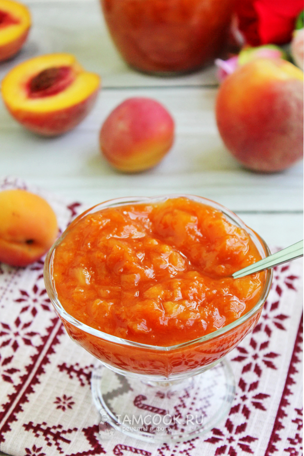 Пропорции ингредиентов для заготовки джема из абрикосов и персиков на зиму - в списке ингредиентов.