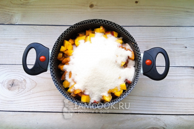 Через несколько часов фрукты пустят сок. Но если у вас нет времени, то можно поступить проще. Налейте в кастрюлю с абрикосами и персиками 100 мл воды и поставьте на плиту. Буквально через 5-6 минут сахар растворится.