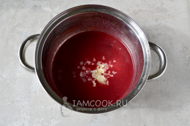 Проварите 5 минут и добавьте пропущенный через пресс чеснок. Варите еще 5-6 минут.