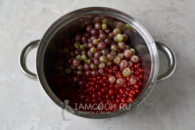 Смородину снимите с веточек. Ягоды промойте в большом количестве воды. Откиньте на сито, чтобы лишняя влага стекла. У крыжовника отрежьте мохнатые хвостики и плодоножку. Это удобно делать маникюрными ножницами. Крыжовник промойте и также откиньте на сито, чтобы стекла вода.