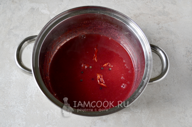 Размешайте, чтобы соль и сахар растворились, и варите еще 5 минут. Добавьте черный перец горошком и острый красный перец.