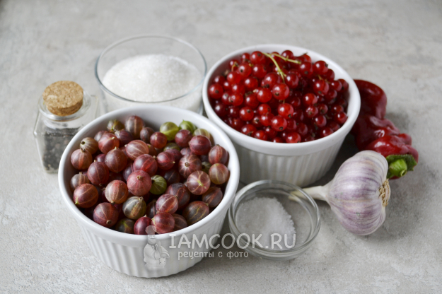 Продукты для приготовления соуса из крыжовника и красной смородины к мясу на зиму - перед вами.