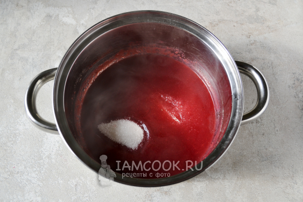 Перелейте пюре в кастрюлю и при слабом кипении уваривайте массу до нужной вам густоты. Мой соус уваривался примерно 20 минут. Затем всыпьте сахар и соль.