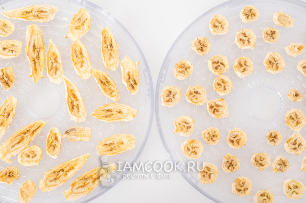 Если вы планируете сушить сразу много бананов, то нарезав и уложив один поддон, сразу ставьте его сушиться. А уж потом приступайте к дальнейшей нарезке и укладыванию на другой поддон. Так бананы не потемнеют и останутся красивыми и светлыми даже без сока лимона.