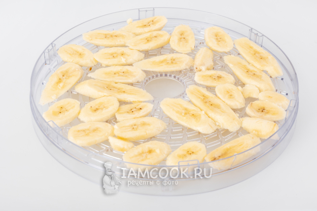 Выложите банановые слайсы на поддон электросушилки. И сразу же поставьте сушиться.