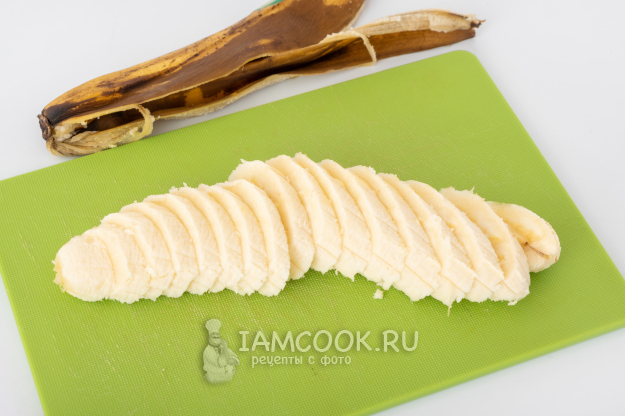Первым делом нужно очистить банан от кожуры и нарезать его. Резать их можно слегка наискосок. Так чипсы получатся продолговатыми. Или просто кружочками.