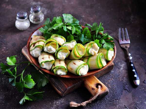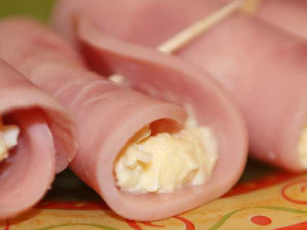 Ломтики можно выложить один на другой, чтобы было удобнее завернуть побольше начинки. На огурцы положите по полной чайной ложке с горкой начинки, скрутите рулетиками.