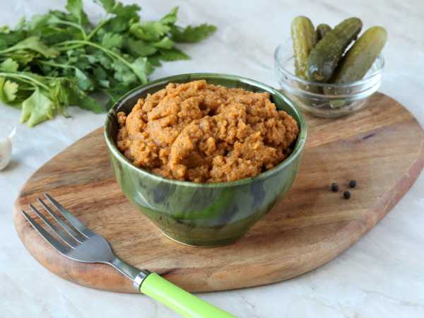 Добавьте вторую половину творожного крем-сыра из упаковки, нарубленный укроп, соль и перец по вкусу. Эту начинку протрите вилкой с крупными зубцами до пастообразного состояния. При желании в нее тоже можно добавить немного чеснока для аромата.
