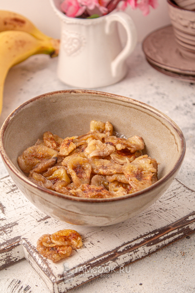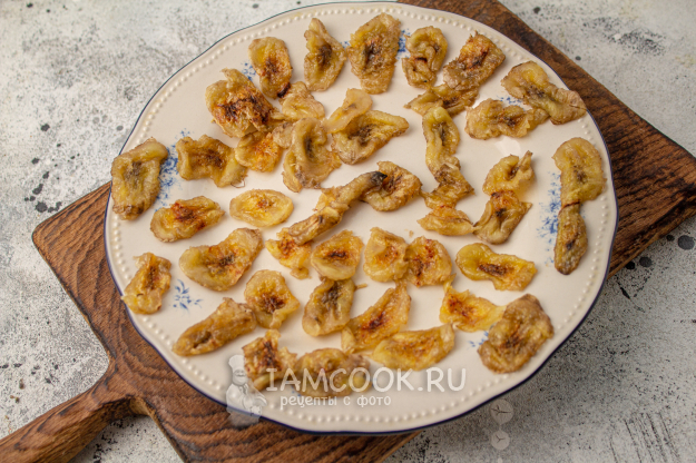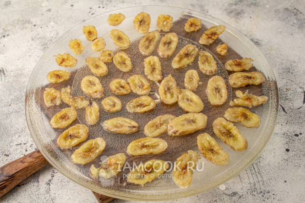Аккуратно переложите бананы на блюдо в один слой и оставьте подсушиться еще на пару часов при комнатной температуре.