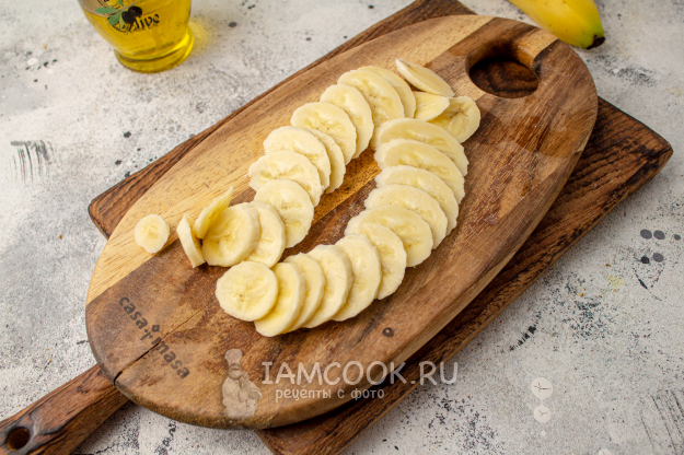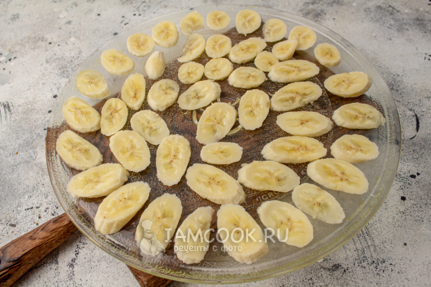 Бананы очистите от кожуры, нарежьте мякоть на тонкие кружочки. Учитывайте момент, что чем тоньше нарезаны бананы, тем быстрее они подсушатся.