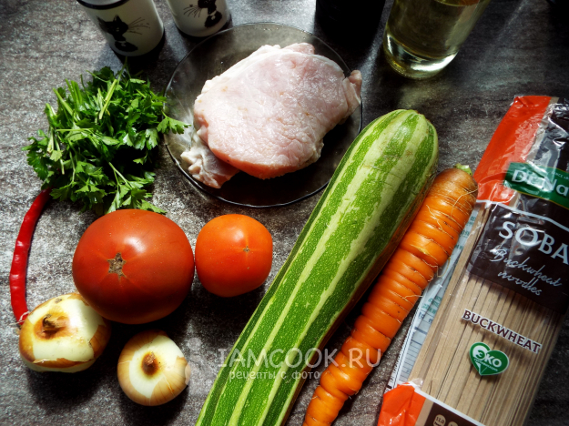 Необходимый набор продуктов для приготовления гречневой лапши со свининой и овощами - перед вами.