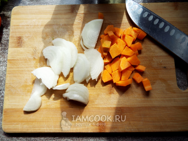 Нарезать кубиком кабачок. У меня молодой, делала со шкуркой.