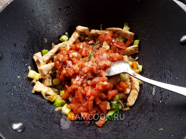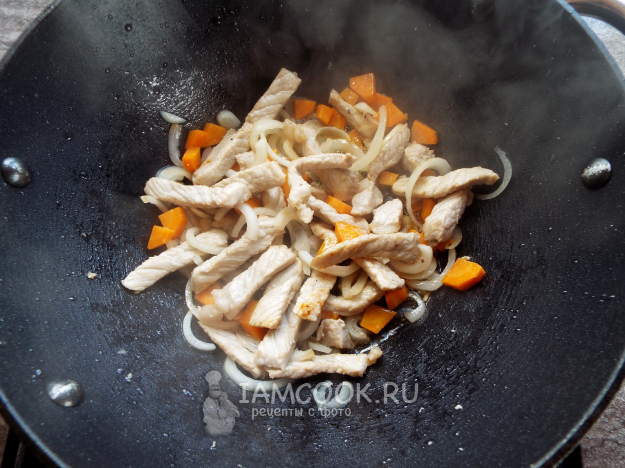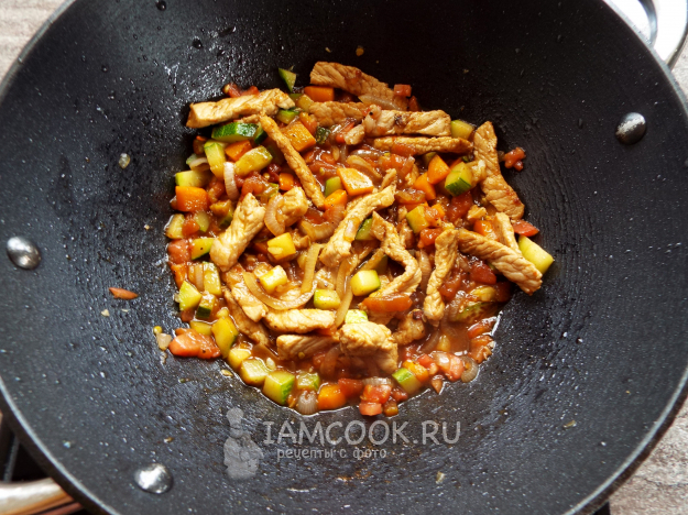 Добавить овощи к мясу и жарить на огне выше среднего.