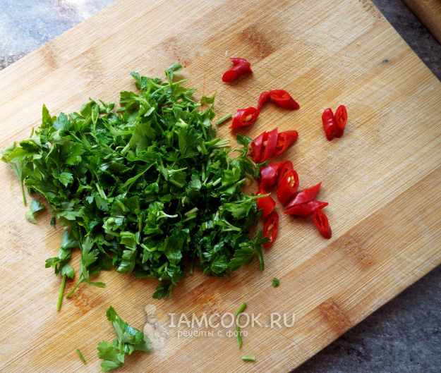 Помидор ошпарить кипятком, затем снять шкурку и нарезать мелким кубиком.