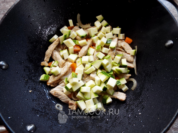 Отправить в казан. Перемешать. Готовить до мягкости кабачка и моркови.