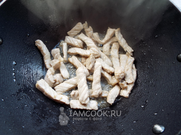 Разогреть масло и быстро обжарить мясо, помешивая, до лёгкого подрумянивания.
