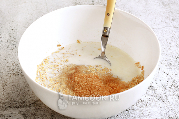 Овсяные хлопья долгой варки залейте молоком. Добавьте соль, сахар, разрыхлитель, ванилин и оставьте минут на 15, чтобы зерна чуть набухли.